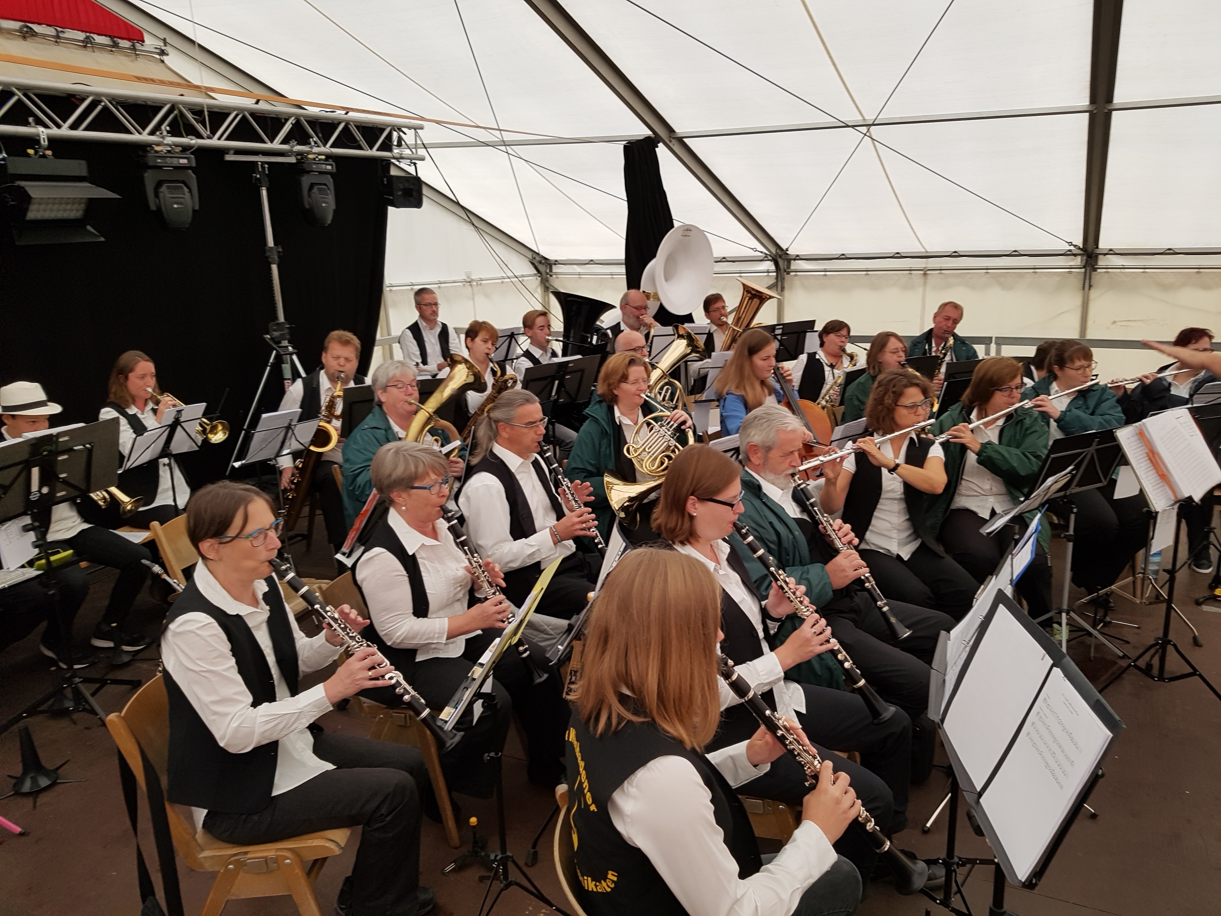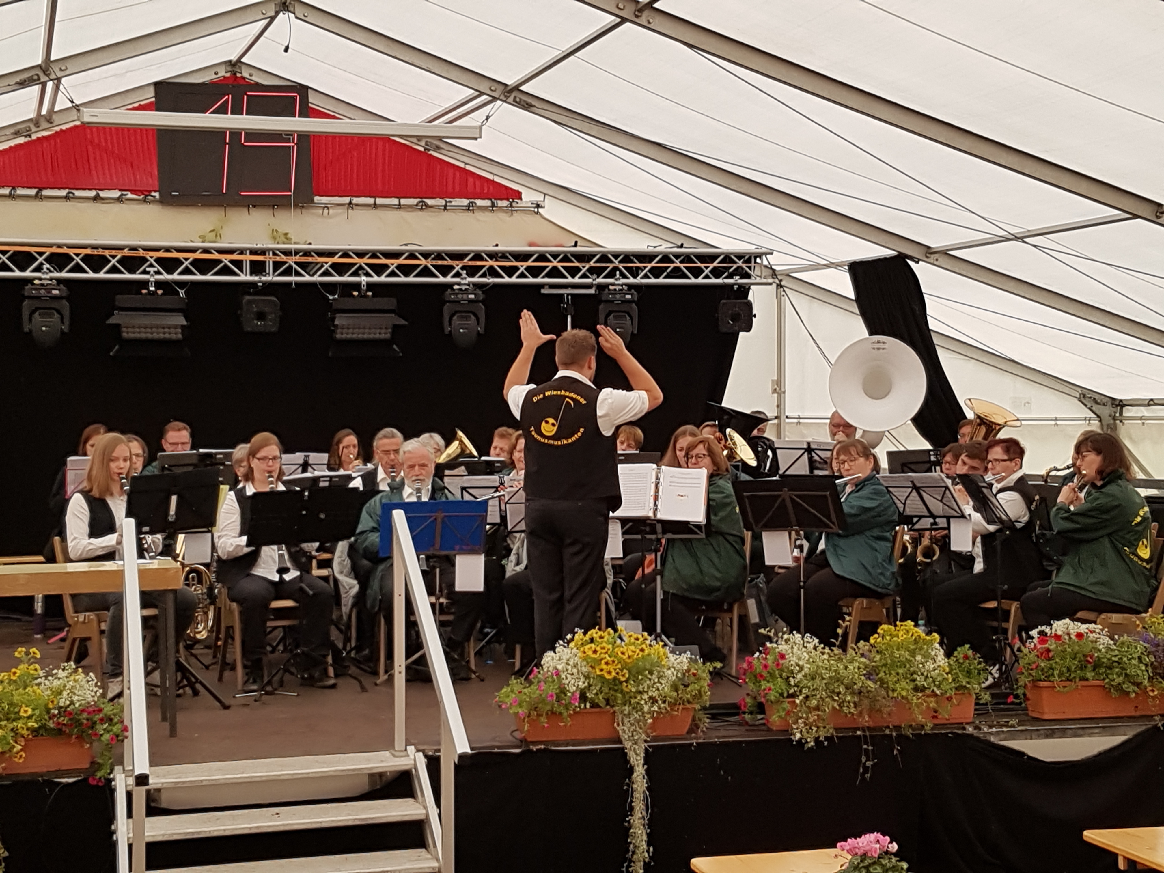 Beschwingt trafen sich anschließend Gemeinde und Musiker am Essenstand, um sich gemeinsam für den Umzug zu stärken. Pünktlich zum Aufstellungszeitpunkt kamen nur noch wenige Tropfen vom Himmel, und weil Petrus ein heimlicher Wallauer ist, ließ er die Zugteilnehmer trockenen Fußes zwei Stunden durch Wallau ziehen. An der Kirche gaben wie gewohnt die Kerbeeltern ihre alljährliche Rede zum besten, in der sie insbesondere mit der Hofheimer Politik abrechneten. Ein kleines Platzkonzert von Wiesbadener Taunusmusikanten und Wallauer Ländchesmusikanten rundeten den vergnüglichen Nachmittag ab. Extra für diesen Anlass hatte der Vorsitzende der Wiesbadener Taunusmusikanten Karsten Schindler für den „Bozener Bergsteigermarsch“ einen speziellen Text für Wallau geschrieben, was mit großer Begeisterung durch die Zuschauer aufgenommen wurde. Ohne Zugaben ließen die Mitglieder der Kerbegesellschaft die Musiker nicht weiterziehen und so wurde gemeinsam das „Trompeten-Echo“ und der „Tiger Rag“ angestimmt. Mit großen Applaus traten die Wiesbadener Taunusmusikanten die letzten Meter Richtung Kerbeplatz an. Nach sechs Stunden mit viel Musik und guter Laune verabschiedeten sich die Musiker von der Wallauer Kerb 2019.