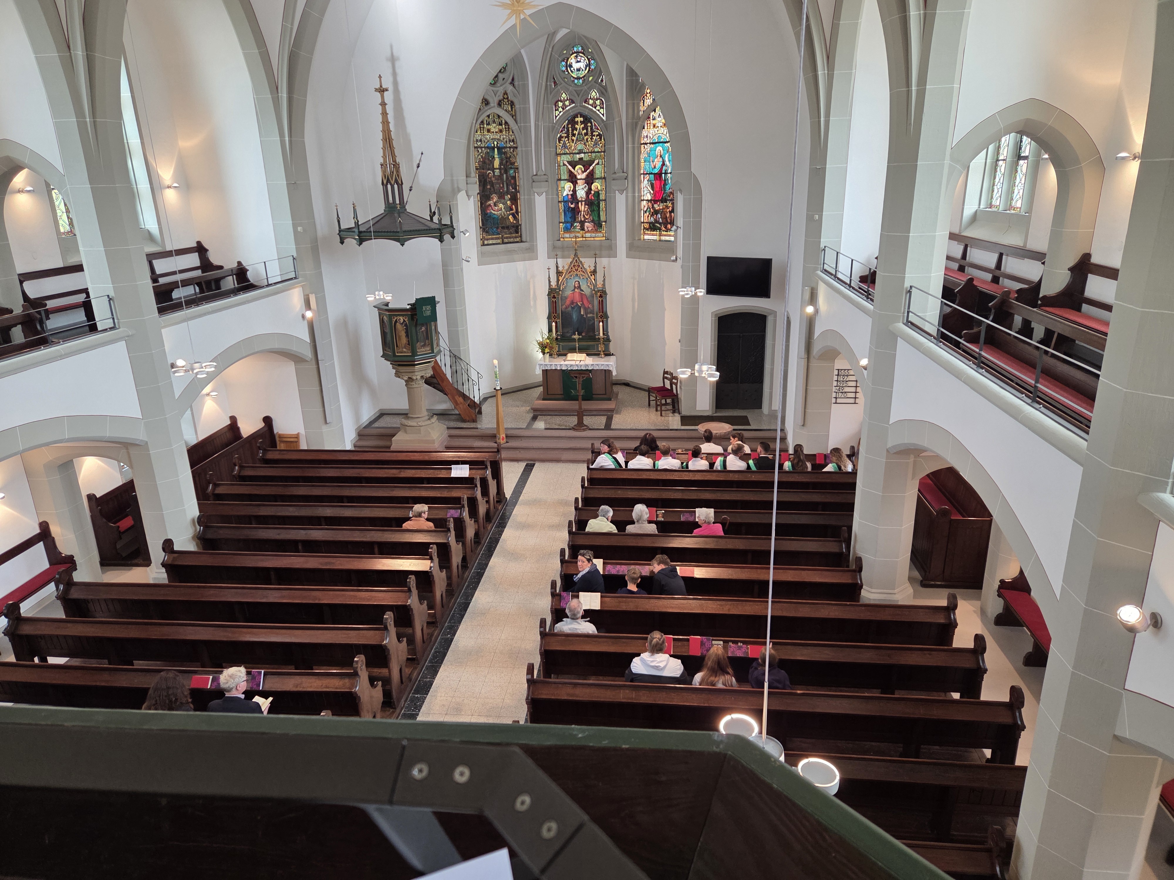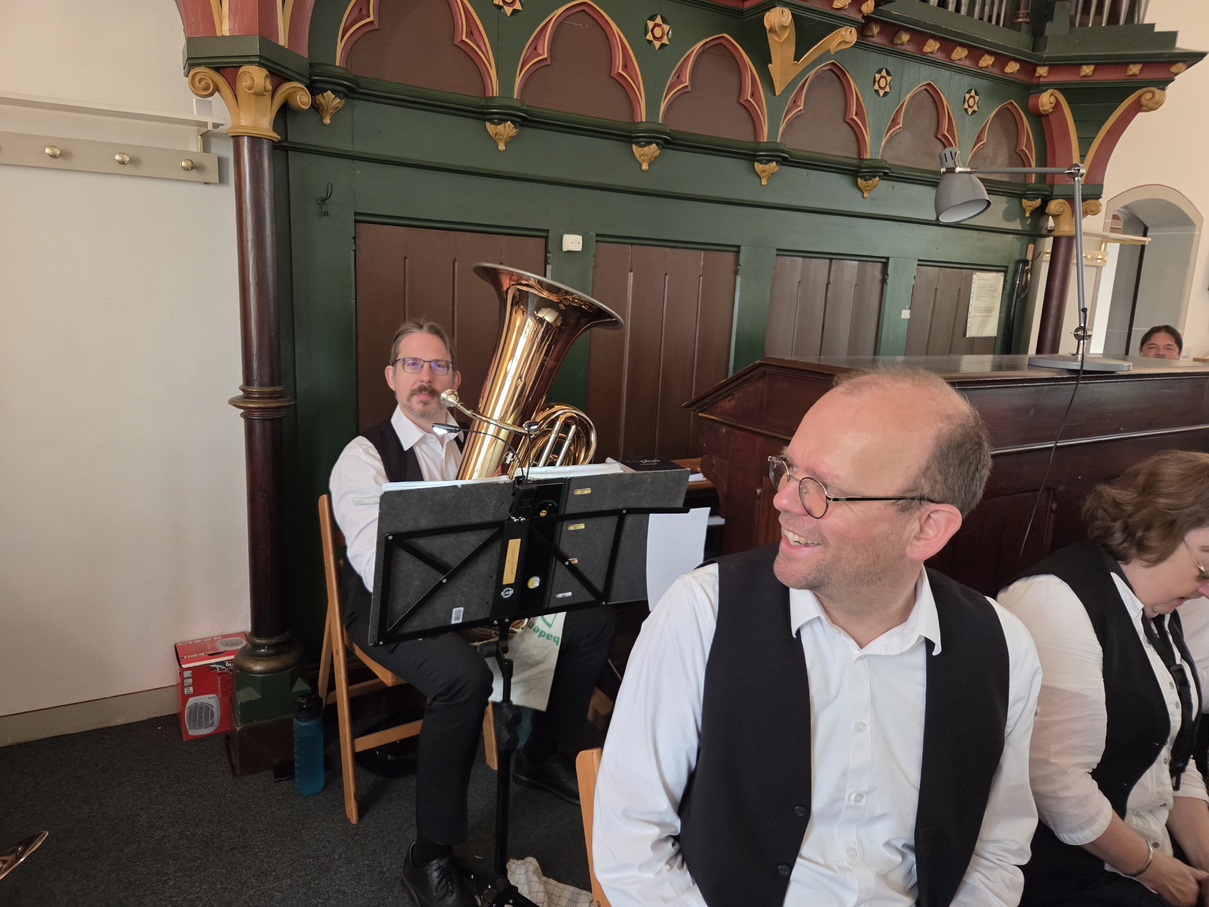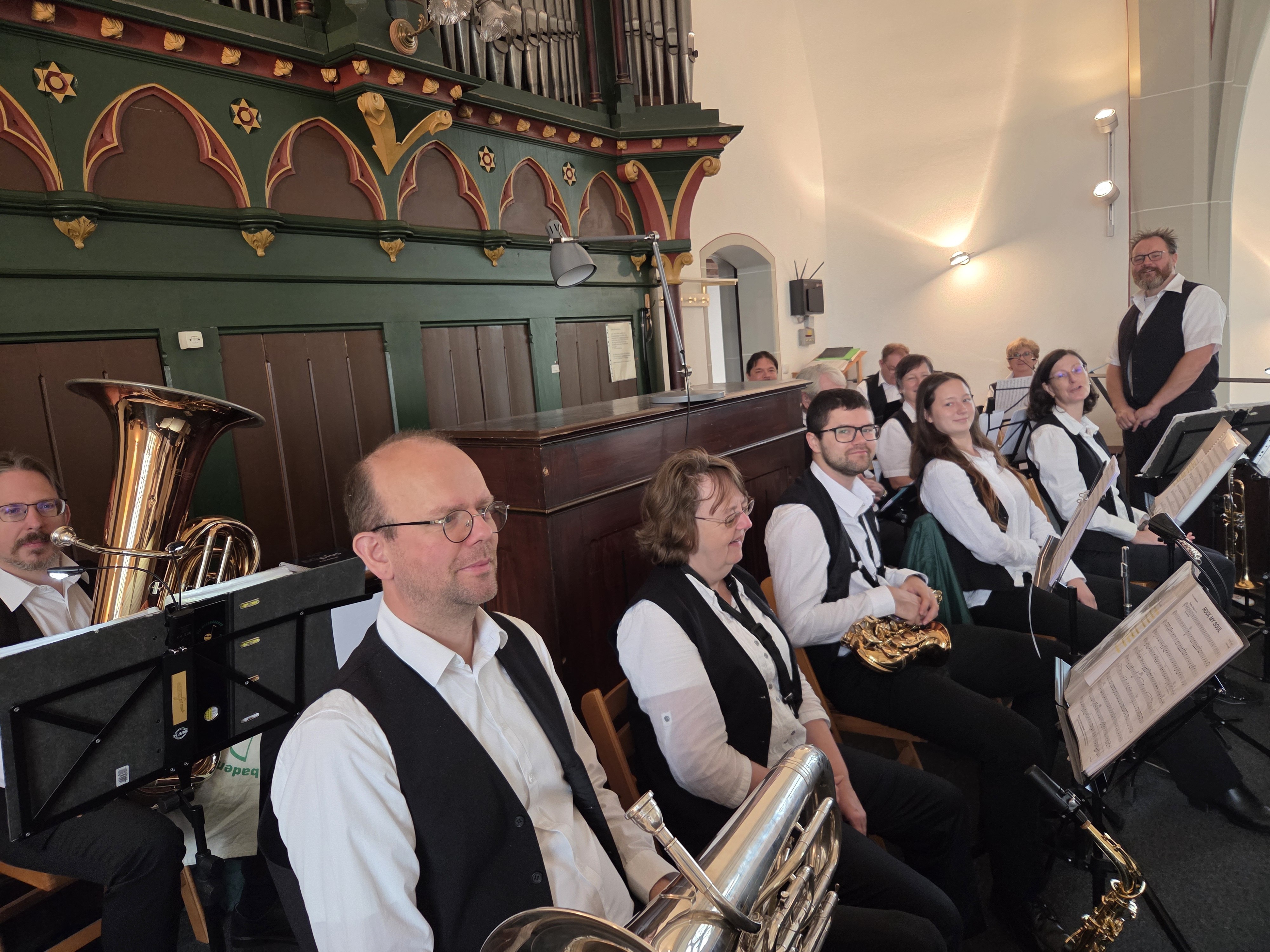 Denn auf die Orgelempore Ländchesdoms passen nur ca. 15 Musikerinnen und Musiker inklusive Schlagzeug, weiterer Instrumente und Notenständer. Aber auch diese Herausforderung wurde gerne angenommen, und so nahm eine Auswahl der Wiesbadener Taunusmusikanten die Kerbe-Festgemeinde mit dem Swing-Klassiker „Rock my Soul“ mit in einen fröhlichen Gottesdienst, der von Pfarrerin Petra Rauter-Milewski, die – wenn sie nicht auf der Kanzel steht – ebenfalls mit dem Saxophon bei den Wiesbadener Taunusmusikanten mit dabei ist. Mit einer bunten Mischung verschiedener Kirchenlieder, mal choralartig, mal rockig, feierte die Delkenheimer Kerbegesellschaft mit der ganzen Gemeinde einen wunderbaren Gottesdienst. Zum Schluss verabschiedeten sich die Wiesbadener Taunusmusikanten mit „Wellerman“ von Delkenheim – nicht ohne einen Schlussapplaus.