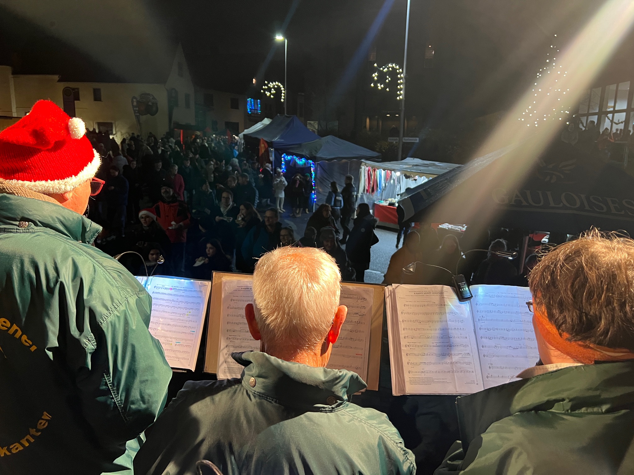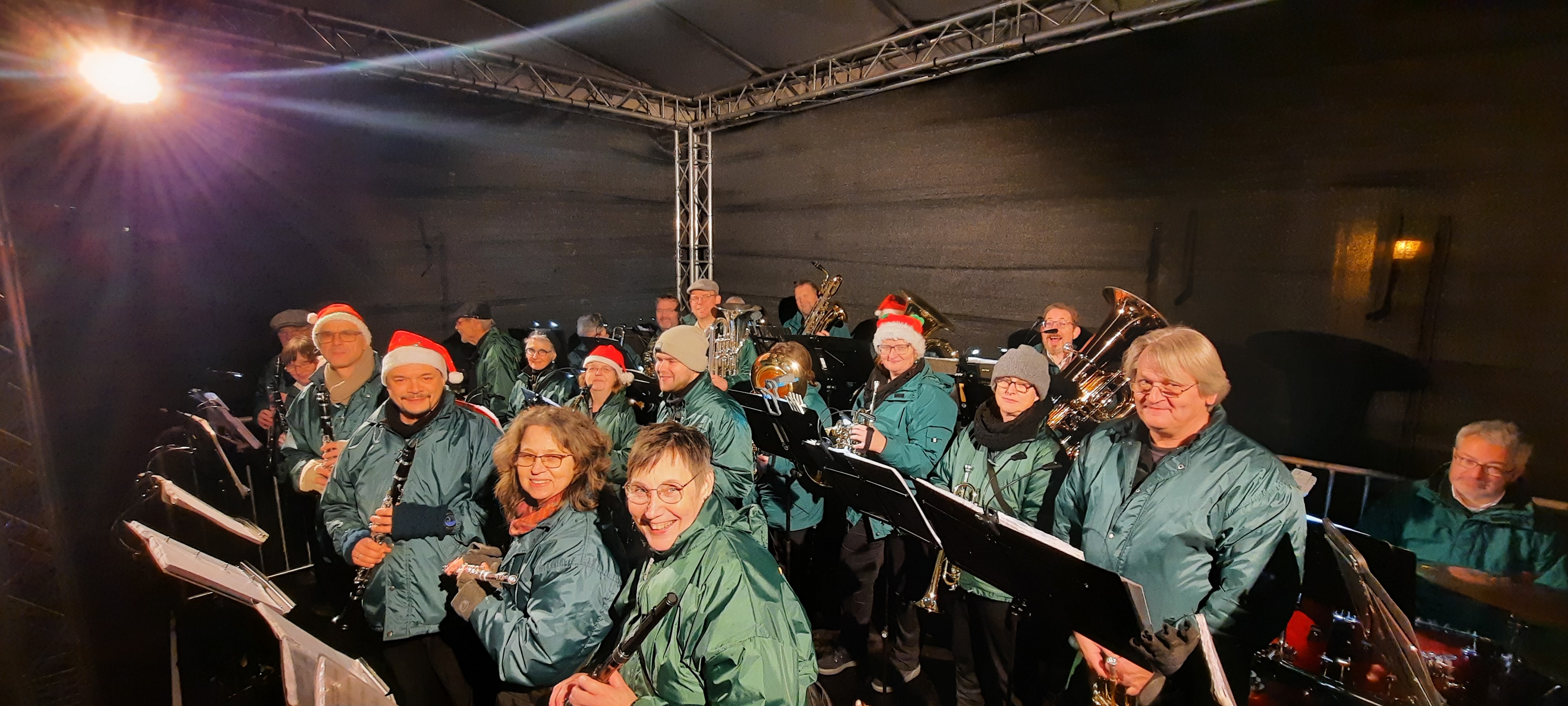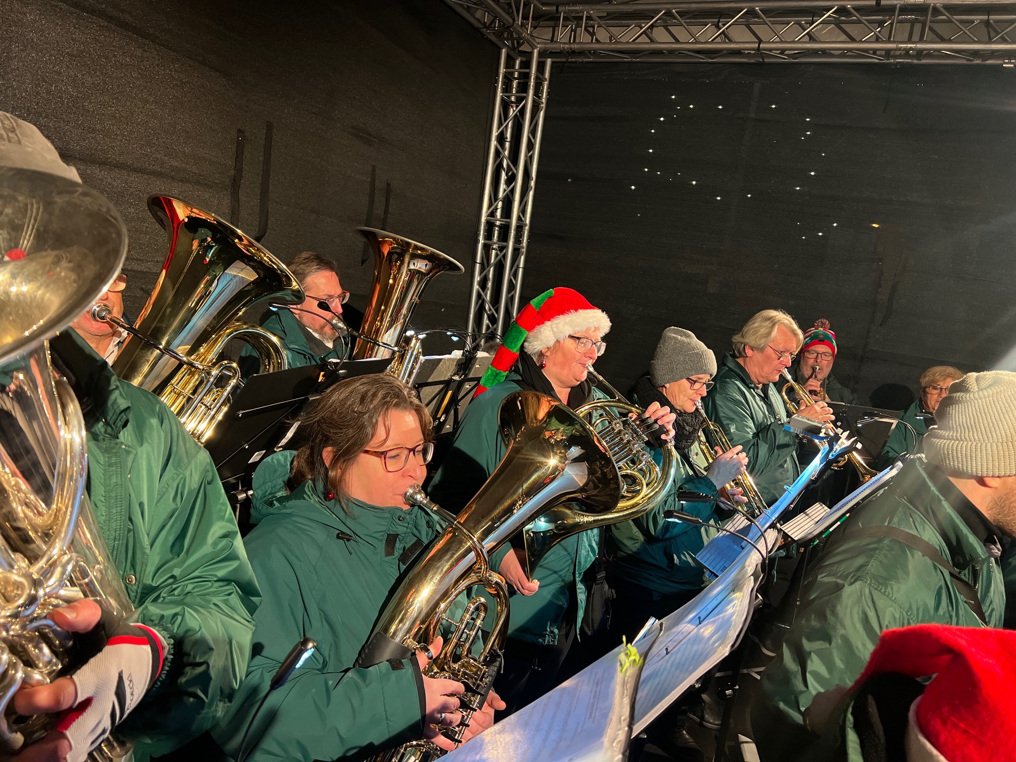 „Warm“-gespielt ging es dann am Sonntag auf dem großartigen Weihnachtsmarkt nach Kriftel. Traditionell spielen die Musikerinnen und Musiker hier knapp 4 Stunden von 15.30 Uhr bis 19 Uhr für die zahlreichen Besucherinnen und Besucher – und dank des umfangreichen Repertoires der Wiesbadener Taunusmusikanten doppelte sich nur am Ende dabei „Feliz Navidad“, das sich aus den Reihen der Zuhörer begeistert gewünscht wurde. Vor allem die Kleinsten Kinder hatten Ihren Spaß und tanzten vor der Bühne. Einige wagten sogar den Gang auf die selbige, um quasi am Rockzipfel des Orchesters in die Noten zu schauen und mitzusingen. Es war einfach toll! Selbst der kurz vor Schluss einsetzende Regen tat der Stimmung keinen Abbruch. Mit dem großen Geläut der St. Vitus-Kirche beendeten die 30 Musikerinnen und Musiker den kurzweiligen und vergnügten Auftritt.