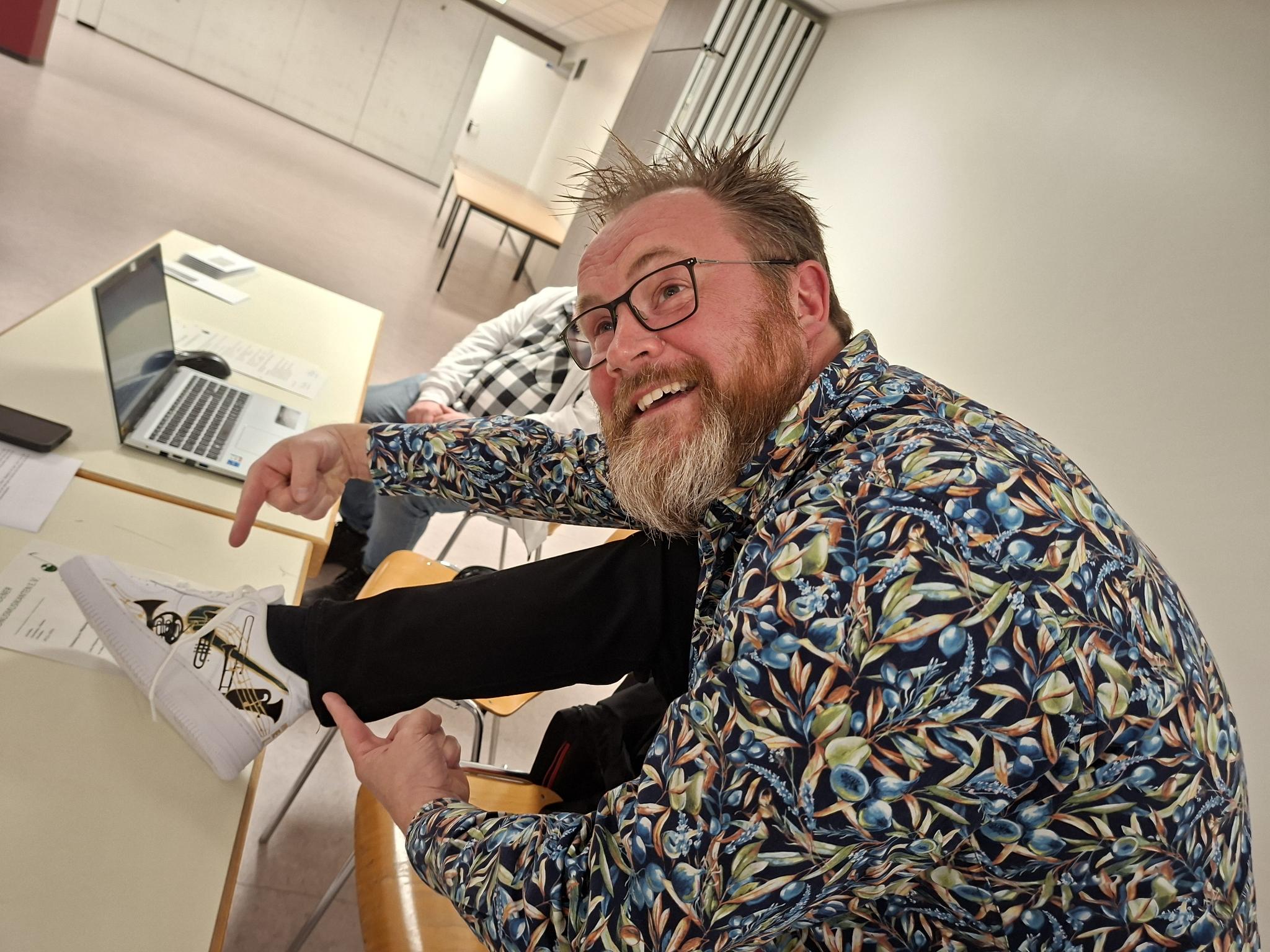 Ein besonderes Highlight war das „Dankeschön“-Präsent, das die aktiven Mitglieder „ihrem“ Karsten überreichten: Handbemalte und musikalisch gestaltete Sneaker für den bunte Schuhe liebenden nun Ex-Vorsitzenden des Vereins. Dieses wirklich wunderbare Geschenk überraschte Karsten sehr und man konnte förmlich sehen, wie er um die passenden Dankesworte für diese unerwartete, aber immens eindrucksvolle Geste, rang.
