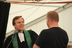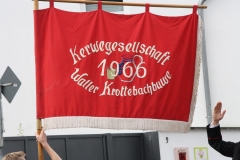 Nach dem Gottesdienst und einer kurzen Mittagspause startete um 13.30 Uhr der Kerbeumzug. Liebe Gewohnheit ist es mittlerweile geworden, dass die Musiker direkt hinter der Miniatur-Kirche marschieren und damit die Kutsche mit Kerbe-Vater und Kerbe-Mutter quer durch Wallau zu führen. Und auch in diesem Jahr zeigte sich wieder: Petrus muss ein Wallauer sein! Nach dunklen Wolken am Morgen blickte bereits während des Gottesdiensts die Sonne hervor und brachte die Zugteilnehmer und Zuschauer gehörig ins Schwitzen. Höhepunkt des Umzuges war der Stopp an der Kirche, an dem die Kerbe-Eltern in ihrer jährlichen Ansprache die großen und kleinen Wallauer Ereignisse des vergangenen Jahres aufs Korn nahmen. Im Anschluss an die Rede sorgten die Wiesbadener Taunusmusikanten mit dem Wallauer Musikzug für großartige Stimmung bei Kerbegesellschaft und Publikum.
